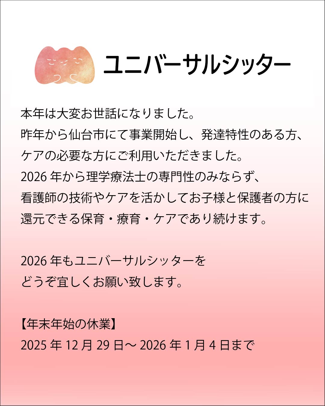 2026年1月より看護師スタッフが入職することになりました。 ユニバーサルシッターはこれまで通り、理学療法士の専門性を活かして、発達特性のあるお子様や療育を必要としているお子様への保育に加え、「ケアの必要とするお子様」へ […]