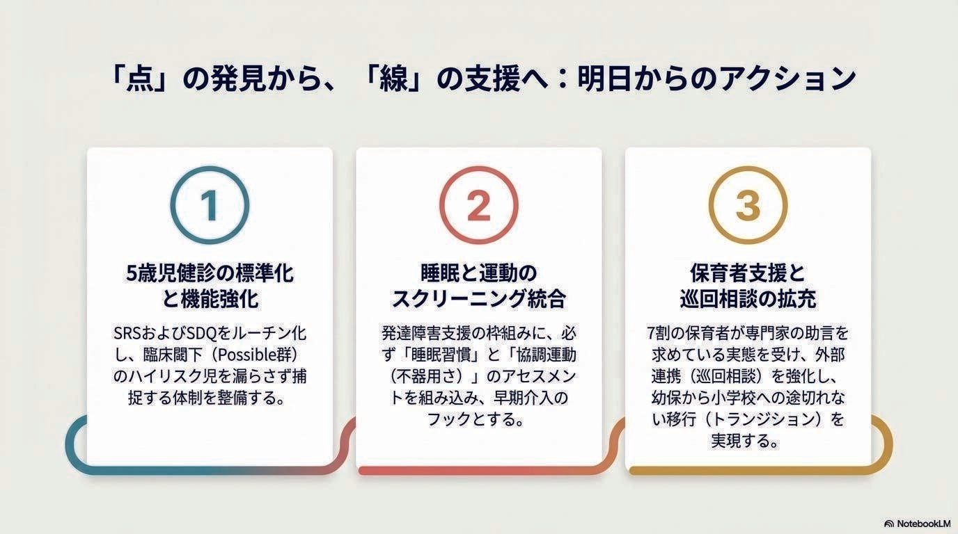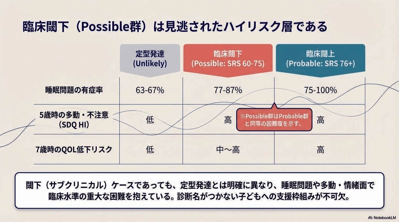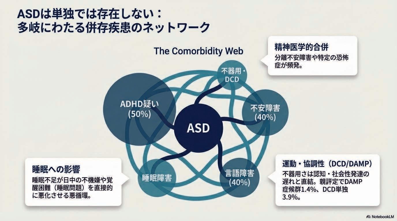 「定型発達」はとても聞こえがいいが、睡眠障害、不器用、不安障害、言語障害が見え隠れするケースもあり、ASDは併存疾患が多岐にわたるので、ハイリスクが見逃されやすい。
