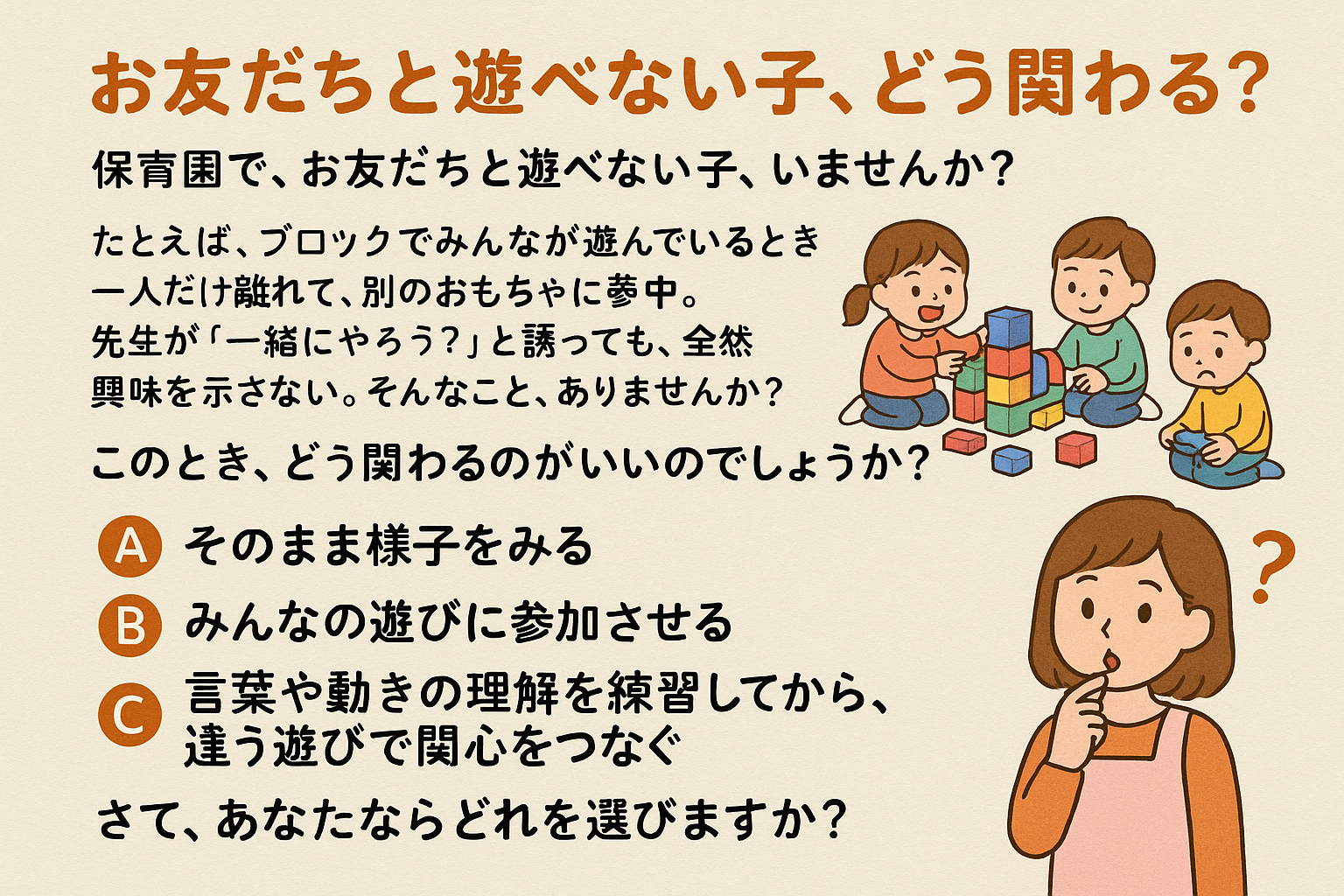 発達が気になる子どもは、「遊びたくない」のではなく、どう遊べばいいかわからないことが多いのです。