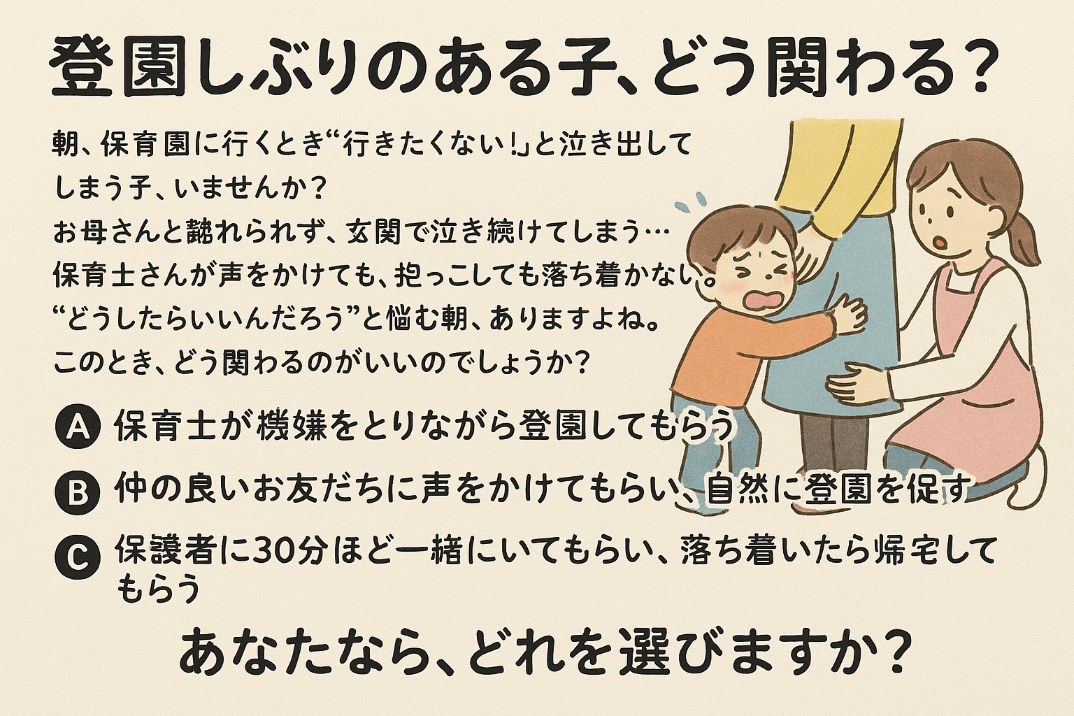 「朝、保育園に行くとき“行きたくない!”と泣き出してしまう子、いませんか?」お母さんと離れられず、玄関で泣き続けてしまう…。保育士さんが声をかけても、抱っこしても落ち着かない。“どうしたらいいんだろう”と悩む朝、ありますよね。このとき、どう関わるのがいいのでしょうか?