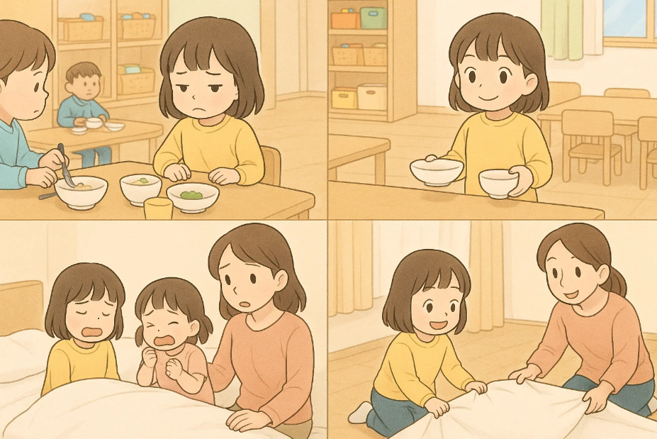 保育園で集団生活に馴染めず、いつも1人で遊んでいます。また、先生の話を聞く、お昼ご飯の準備や片付けをするなどの場面の切り換えに時間がかかります。ご自宅での生活場面でも朝の登園準備、お風呂や寝かしつけに時間がかかり、生活リズムが崩れがちと保護者から相談がありました。