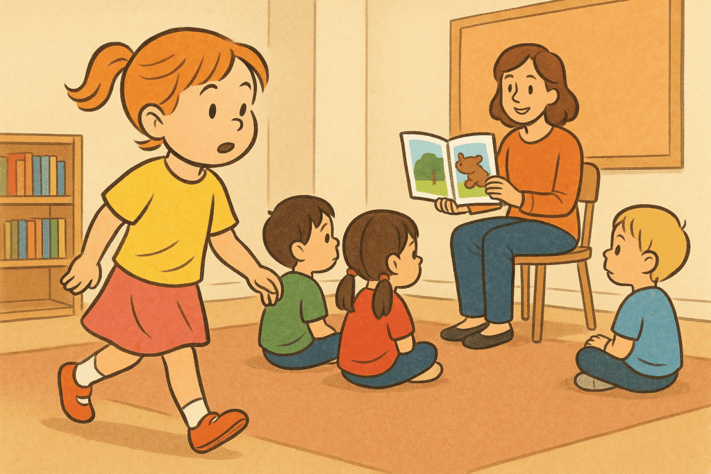 絵本の読み聞かせの時間、他の子が静かに座って先生の話を聞いている中で、ひとりだけ立ち上がって部屋の隅を歩き回る子がいます。